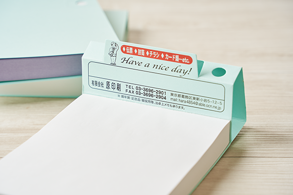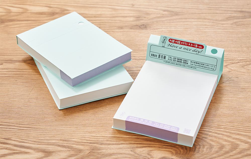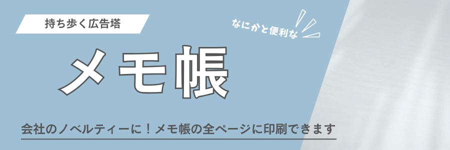 会社のノベルティーとして人気を誇るメモ帳。全ページに会社名や電話番号などを印刷できるため、オリジナリティのあるアイテムに仕上がります。