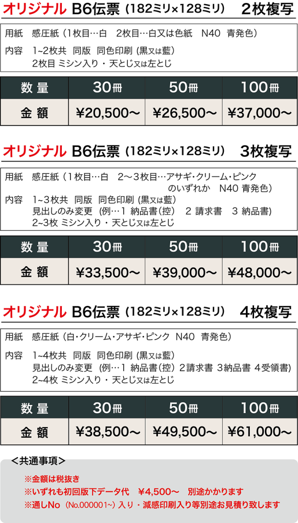 2枚複写から4枚複写まで、サイズや項目など完全にオリジナルで作成いたします。