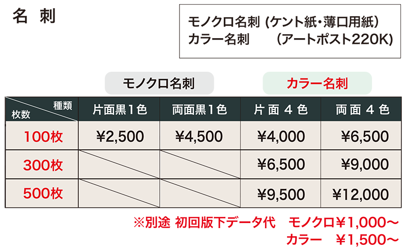 また、以前ご利用の印刷業者が廃業された場合でも、現在お使いの名刺をお持ちいただければ、現物からデータを作成し、スムーズに引き継ぎます。